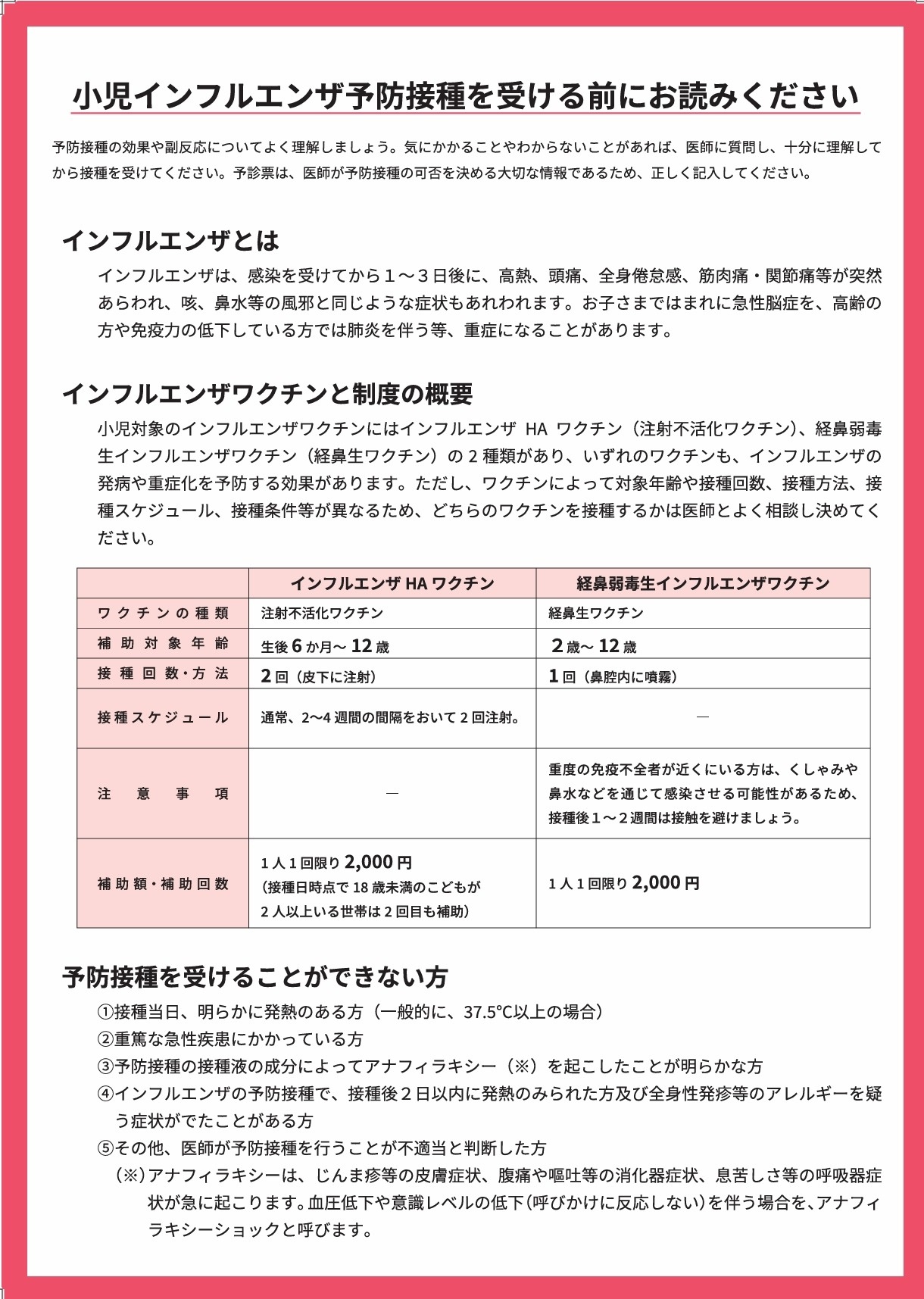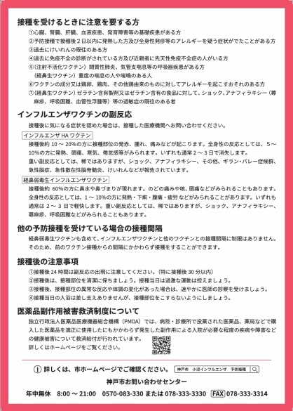 インフルエンザワクチンの接種も感染予防に効果的です。生後 6 か月から接種できますので、お子さまの予防接種についてはかかりつけの先生に相談して、ご検討ください。